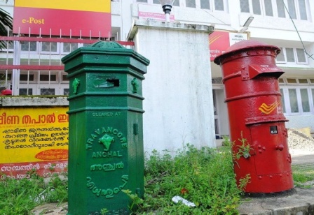(Image: Post-box of erstwhile Travancore and new Indian post-box erected in front of the Head Post Office, Vaikom in Kerala) |
